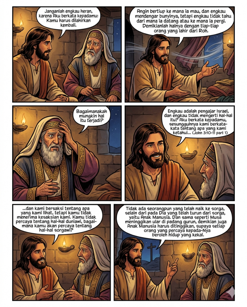 Lalu Injil Yohanes (Yoh 3:7-15) membawa kita kembali ke percakapan yang belum selesai: tentang kelahiran baru. Yesus berbicara tentang sesuatu yang tidak bisa direduksi menjadi usaha moral atau sistem sosial. “Kamu harus dilahirkan kembali.” Artinya, perubahan sejati bukan pertama-tama soal tindakan lahiriah, tetapi transformasi dari dalam—sebuah cara hidup yang lahir dari Roh.