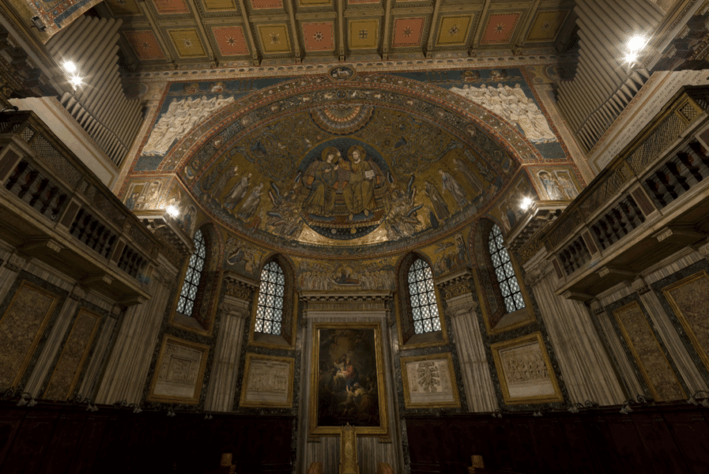 Aku mengangkat sedikit wajahku, menatap ke arah mosaik besar di lengkung apsis. Mosaik itu seperti hidup dalam cahaya redup basilika. Emasnya tidak bersinar terang, tetapi berdenyut halus, seperti napas yang baru kutahu sedang menyertai gerak kecil ikon di depan altar. Mosaik itu adalah karya dari abad ke-5, mosaik yang dibuat pada masa Paus Sixtus III—mosaik yang telah menyaksikan kota ini diguncang oleh perang, wabah, kebakaran, pemimpin yang saling menggantikan, dan peziarah yang datang tanpa pernah berhenti.