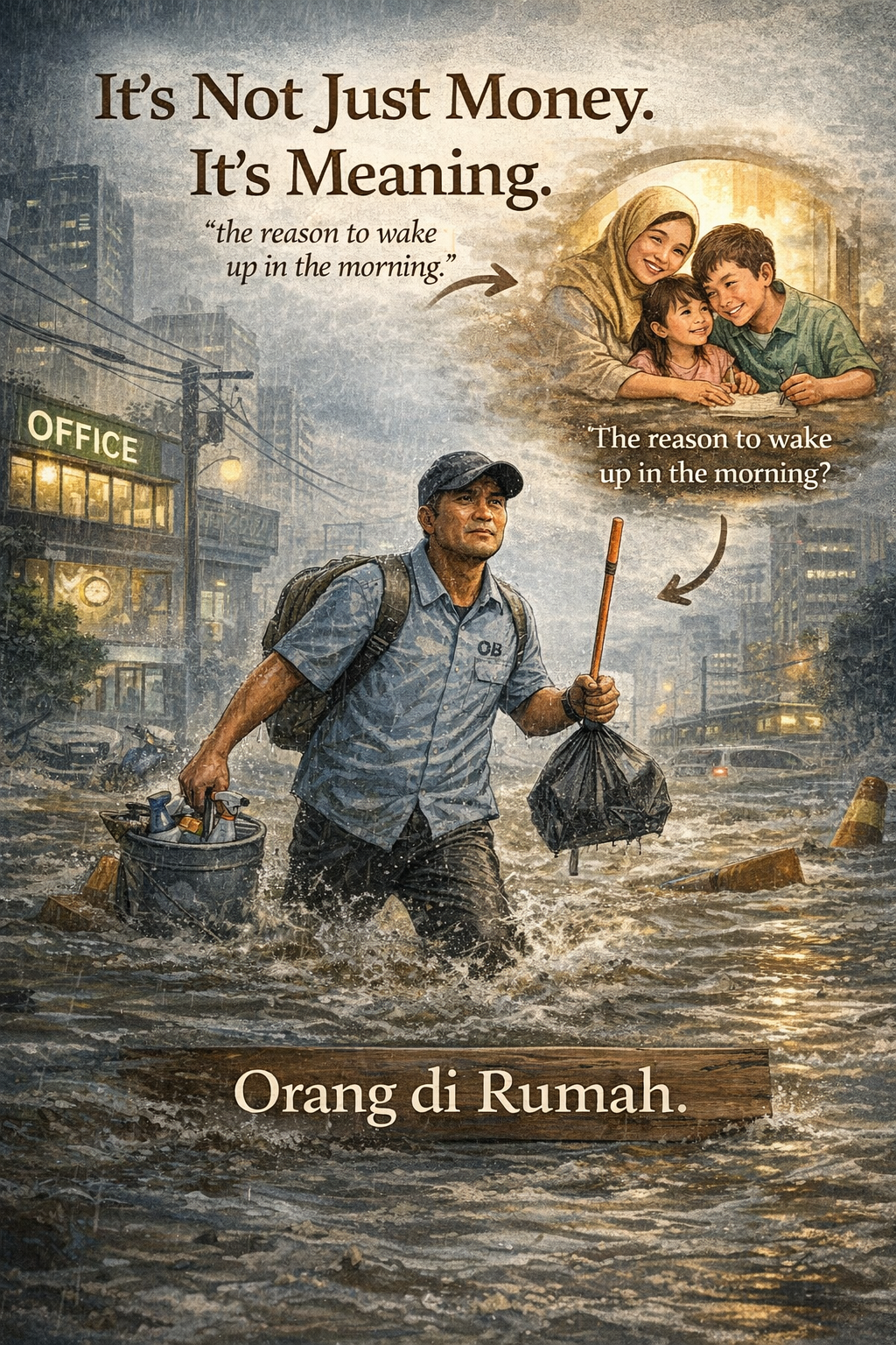 Di situ saya teringat buku The Why of Work (Dave Ulrich). Ada kalimat yang sederhana tapi keras bunyinya: “It’s not just money. It’s meaning.” Ulrich juga menulis bahwa lewat kerja kita mencari “purpose, contribution, connection, value, and hope.” Dan pada OB itu, “meaning” tampak bukan sebagai jargon—melainkan sebagai tekad sunyi: berangkat pagi dan menembus banjir bagi orang lain, agar ia bisa pulang membawa kepastian untuk keluarganya.
