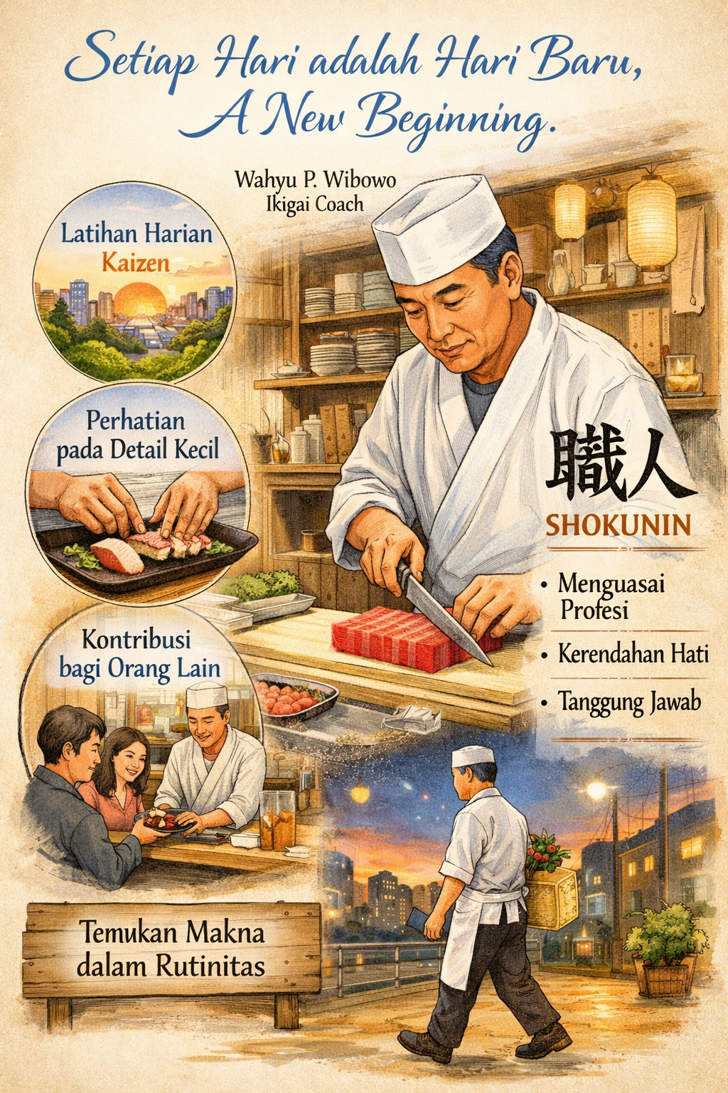Ucapan “Happy New Year” sudah mulai mereda. Kini kita kembali hidup ke ritme rutinitas: bangun pagi, berangkat, bekerja, pulang, lalu mengulang lagi keesokan harinya. Pagi ini saya menonton YouTube tentang kegiatan harian seorang chef sekaligus pemilik restoran kecil di Tokyo. Polanya nyaris sama setiap hari: subuh belanja ikan dan sayur, bersih-bersih dan menyiapkan bahan, memasak, buka jam 10, melayani tamu sampai jam 8 malam, lalu pulang. Yang membuat saya tertegun: meski ini sudah ia jalani lebih dari 25 tahun, ia tidak menurunkan standar—tetap teliti dan tidak kompromi dalam memilih bahan: tuna terbaik untuk sashimi dan sushi. Baginya setiap hari adalah hari baru, a new beginning.